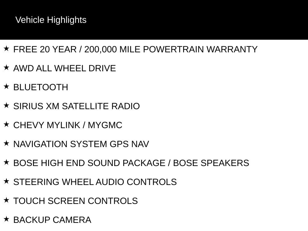 FREE 20 YEAR / 200,000 MILE POWERTRAIN WARRANTY, AWD ALL WHEEL DRIVE, BLUETOOTH, SIRIUS XM SATELLITE RADIO, CHEVY MYLINK / MYGMC, NAVIGATION SYSTEM GPS NAV, BOSE HIGH END SOUND PACKAGE / BOSE SPEAKERS, STEERING WHEEL AUDIO CONTROLS, TOUCH SCREEN CONTROLS, BACKUP CAMERA, WIRELESS CHARGING, HEADS-UP DISPLAY, KEYLESS PUSH BUTTON START, AUTOMATIC HEADLIGHTS, COLLISION AVOIDANCE SYSTEM, COLLISION WARNING ALERT SYSTEM, ADAPTIVE CRUISE CONTROL, POWER DRIVER SEAT, POWER PASSENGER SEAT, PANORAMIC SUNROOF/MOONROOF, MEMORY PACKAGE / MEMORY SEAT, REMOTE START, POWER LIFTGATE, HEATED STEERING WHEEL, ALL WEATHER FLOOR MATS, HEATED/COOLED LEATHERETTE SEATS, HEATED REAR LEATHERETTE SEATS, SS SERIES, ALL-WEATHER LINER PACKAGE, PREFERRED EQUIPMENT PACKAGE 2SS, 22 MACHINED ALUMINUM WHEELS, 8 SPEAKERS, AIR CONDITIONING, AUTOMATIC TEMPERATURE CONTROL, BRAKE ASSIST, DELAY-OFF HEADLIGHTS, DRIVER VANITY MIRROR, EMERGENCY COMMUNICATION SYSTEM: ONSTAR AND CHEVROLET CONNECTED SERVICES CAPABLE, FRONT DUAL ZONE A/C, LOW TIRE PRESSURE WARNING, OCCUPANT SENSING AIRBAG, OUTSIDE TEMPERATURE DISPLAY, OVERHEAD AIRBAG, OVERHEAD CONSOLE, PANIC ALARM, PASSENGER VANITY MIRROR, POWER DOOR MIRRORS, POWER WINDOWS, RAIN SENSING WIPERS, REAR WINDOW DEFROSTER, REAR WINDOW WIPER, REMOTE KEYLESS ENTRY, SPLIT FOLDING REAR SEAT, SPORT STEERING WHEEL, TELESCOPING STEERING WHEEL, TILT STEERING WHEEL, TURN SIGNAL INDICATOR MIRRORS, VARIABLY INTERMITTENT WIPERS. Price Includes The Following Manufacturer Rebates And Incentives:$1000 - Chevrolet Consumer Cash Program. Exp. 01/02/2026