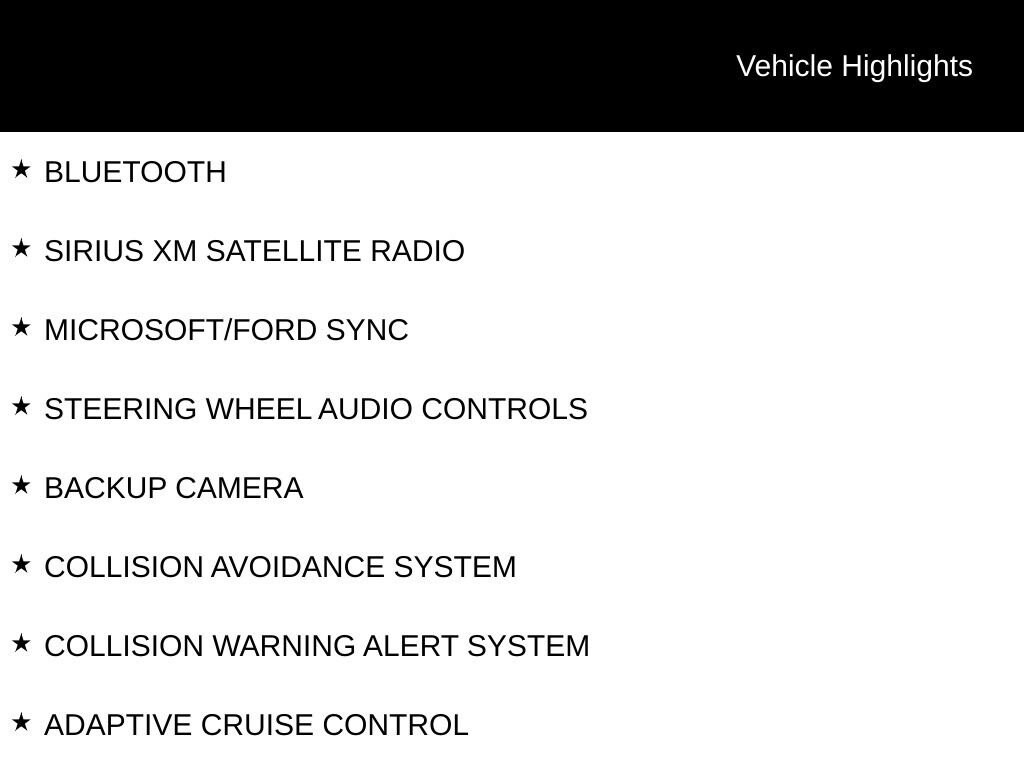 BLUETOOTH, SIRIUS XM SATELLITE RADIO, MICROSOFT/FORD SYNC, STEERING WHEEL AUDIO CONTROLS, BACKUP CAMERA, COLLISION AVOIDANCE SYSTEM, COLLISION WARNING ALERT SYSTEM, ADAPTIVE CRUISE CONTROL, POWER DRIVER SEAT, TOW PACKAGE / TRAILER PACKAGE, XLT SERIES, PREFERRED EQUIPMENT PACKAGE 210A, TRAILER TOW PACKAGE, 16 5-SPOKE SPARKLE SILVER PAINTED ALUMINUM ALLOY WHEELS, 6 SPEAKERS, AIR CONDITIONING, AUTOMATIC TEMPERATURE CONTROL, BRAKE ASSIST, COMPASS, DELAY-OFF HEADLIGHTS, DRIVER ALERT, DRIVER VANITY MIRROR, DUAL FRONT IMPACT AIRBAGS, DUAL FRONT SIDE IMPACT AIRBAGS, DYNAMIC BRAKE SUPPORT, FRONT DUAL ZONE A/C, FRONT FOG LIGHTS, HEATED DOOR MIRRORS, LOW TIRE PRESSURE WARNING, OCCUPANT SENSING AIRBAG, OUTSIDE TEMPERATURE DISPLAY, OVERHEAD CONSOLE, PASSENGER VANITY MIRROR, POWER DOOR MIRRORS, POWER WINDOWS, RAIN SENSING WIPERS, REAR AIR CONDITIONING, REAR WINDOW DEFROSTER, REAR WINDOW WIPER, REMOTE KEYLESS ENTRY, SPEED CONTROL, TELESCOPING STEERING WHEEL, TILT STEERING WHEEL, VARIABLY INTERMITTENT WIPERS.