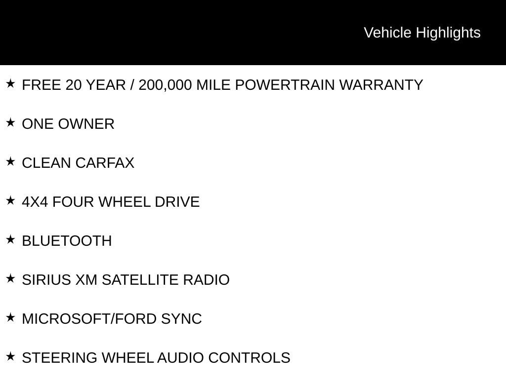 FREE 20 YEAR / 200,000 MILE POWERTRAIN WARRANTY, ONE OWNER, CLEAN CARFAX, 4X4 FOUR WHEEL DRIVE, BLUETOOTH, SIRIUS XM SATELLITE RADIO, MICROSOFT/FORD SYNC, STEERING WHEEL AUDIO CONTROLS, BACKUP CAMERA, WI-FI HOTSPOT, KEYLESS PUSH BUTTON START, EQUIPMENT PACKAGE 101A, 7 SPEAKERS, AIR CONDITIONING, BRAKE ASSIST, COMPASS, DELAY-OFF HEADLIGHTS, DRIVER VANITY MIRROR, ELECTRONIC STABILITY CONTROL, EMERGENCY COMMUNICATION SYSTEM: 911 ASSIST, EXTERIOR PARKING CAMERA REAR, HEATED DOOR MIRRORS, ILLUMINATED ENTRY, INTEGRATED ROLL-OVER PROTECTION, LOW TIRE PRESSURE WARNING, OCCUPANT SENSING AIRBAG, OUTSIDE TEMPERATURE DISPLAY, OVERHEAD CONSOLE, PANIC ALARM, PASSENGER VANITY MIRROR, POWER DOOR MIRRORS, POWER WINDOWS, REMOTE KEYLESS ENTRY, SPEED CONTROL, TELESCOPING STEERING WHEEL, TILT STEERING WHEEL, VARIABLY INTERMITTENT WIPERS, WHEELS: 16 BRIGHT POLISHED SILVER-PAINTED STEEL.