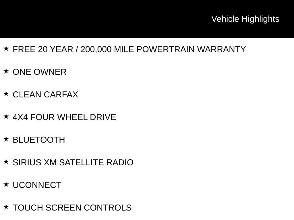 FREE 20 YEAR / 200,000 MILE POWERTRAIN WARRANTY, ONE OWNER, CLEAN CARFAX, 4X4 FOUR WHEEL DRIVE, BLUETOOTH, SIRIUS XM SATELLITE RADIO, UCONNECT, TOUCH SCREEN CONTROLS, BACKUP CAMERA, WIRELESS CHARGING, WI-FI HOTSPOT, KEYLESS PUSH BUTTON START, AUTOMATIC HEADLIGHTS, POWER DRIVER SEAT, HEATED FRONT LEATHER SEATS, REMOTE START, POWER LIFTGATE, HEATED STEERING WHEEL, ALTITUDE SERIES, QUICK ORDER PACKAGE 23B ALTITUDE, 18 FULLY PAINTED ALUMINUM WHEELS, 6 SPEAKERS, AIR CONDITIONING, ANTI-WHIPLASH FRONT HEAD RESTRAINTS, AUTOMATIC TEMPERATURE CONTROL, BRAKE ASSIST, COMPASS, DELAY-OFF HEADLIGHTS, DRIVER VANITY MIRROR, DUAL FRONT IMPACT AIRBAGS, DUAL FRONT SIDE IMPACT AIRBAGS, FRONT BUCKET SEATS, FRONT DUAL ZONE A/C, FRONT LICENSE PLATE BRACKET, GLOSS BLACK EXTERIOR ACCENTS, LOW TIRE PRESSURE WARNING, NORMAL DUTY SUSPENSION, OCCUPANT SENSING AIRBAG, OUTSIDE TEMPERATURE DISPLAY, OVERHEAD CONSOLE, PANIC ALARM, PASSENGER VANITY MIRROR, POWER DOOR MIRRORS, POWER STEERING, POWER WINDOWS, RAIN SENSITIVE WINDSHIELD WIPERS, REAR WINDOW DEFROSTER, REAR WINDOW WIPER, REMOTE KEYLESS ENTRY, SPEED CONTROL, SPEED-SENSITIVE WIPERS, TELESCOPING STEERING WHEEL, TILT STEERING WHEEL.