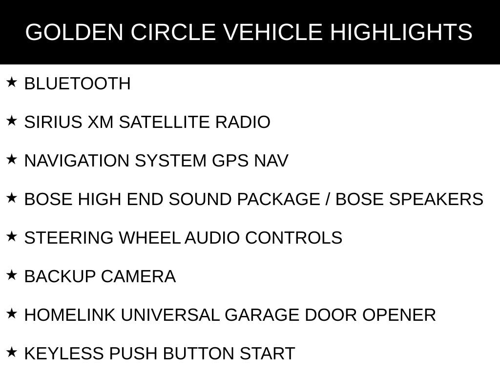 BLUETOOTH, SIRIUS XM SATELLITE RADIO, NAVIGATION SYSTEM GPS NAV, BOSE HIGH END SOUND PACKAGE / BOSE SPEAKERS, STEERING WHEEL AUDIO CONTROLS, BACKUP CAMERA, HOMELINK UNIVERSAL GARAGE DOOR OPENER, KEYLESS PUSH BUTTON START, POWER DRIVER SEAT, POWER PASSENGER SEAT, HEATED/COOLED LEATHER SEATS, HEATED REAR LEATHER SEATS, PANORAMIC SUNROOF/MOONROOF, MEMORY PACKAGE / MEMORY SEAT, REMOTE START, POWER LIFTGATE, HEATED STEERING WHEEL, PLATINUM SERIES, 20" MACHINED ALUMINUM ALLOY WHEELS, 11 SPEAKERS, ABS BRAKES, AIR CONDITIONING, AUTO TILT-AWAY STEERING WHEEL, AUTO-DIMMING REAR-VIEW MIRROR, AUTOMATIC TEMPERATURE CONTROL, CD PLAYER, COMPASS, DRIVER VANITY MIRROR, ELECTRONIC STABILITY CONTROL, FRONT DUAL ZONE A/C, HEATED DOOR MIRRORS, ILLUMINATED ENTRY, LOW TIRE PRESSURE WARNING, NAVIGATION SYSTEM, OUTSIDE TEMPERATURE DISPLAY, OVERHEAD CONSOLE, PASSENGER VANITY MIRROR, POWER DOOR MIRRORS, POWER LIFTGATE, POWER WINDOWS, REAR WINDOW DEFROSTER, REAR WINDOW WIPER, REMOTE KEYLESS ENTRY, SPEED-SENSITIVE WIPERS, TELESCOPING STEERING WHEEL, TILT STEERING WHEEL, TRACTION CONTROL, TURN SIGNAL INDICATOR MIRRORS, VARIABLY INTERMITTENT WIPERS.