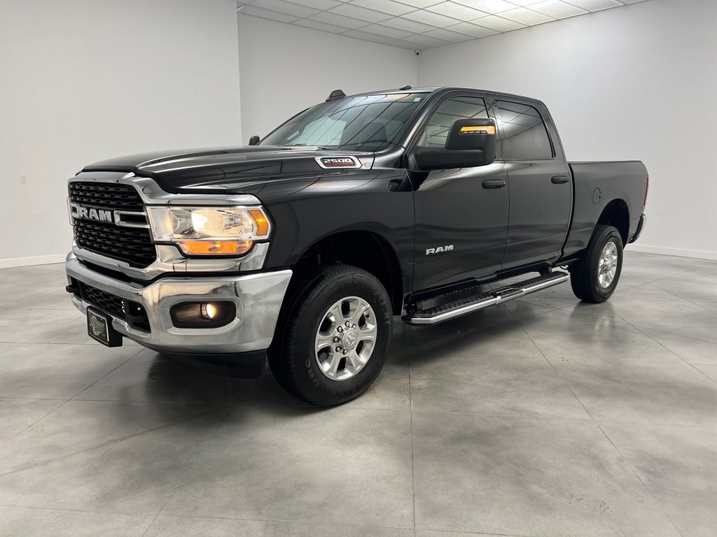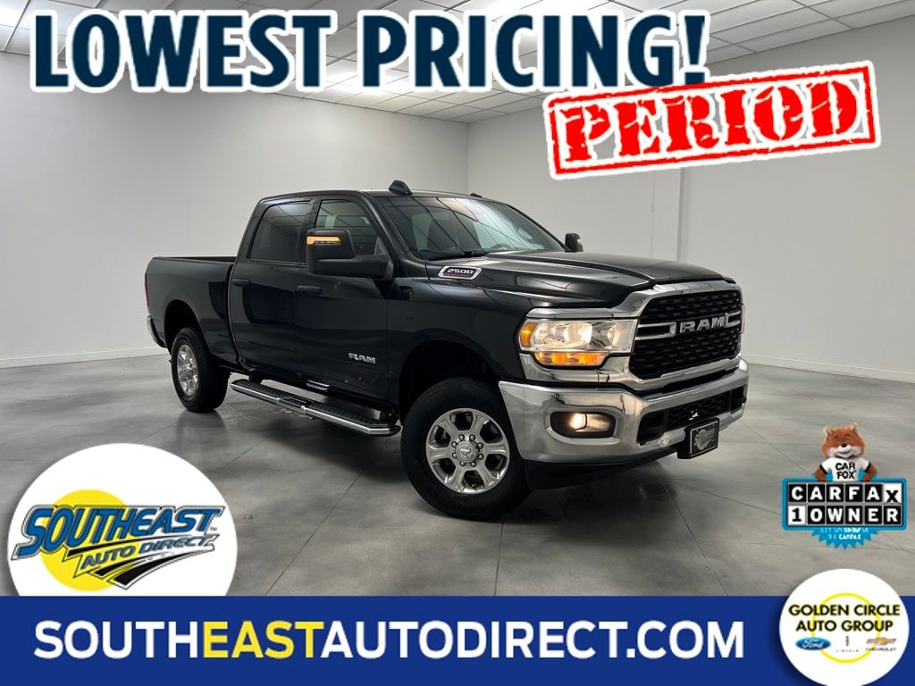 Level 1 Equipment Group (2 Way Rear Headrest Seat, 2nd Row In Floor Storage Bins, 4 Way Front Headrests, 40/20/40 Split Bench Seat, 4G LTE Wi-Fi Hot Spot, 8.4" Touchscreen Display, Apple CarPlay, Auto Power-Folding Mirrors, Big Horn IP Badge, Black Exterior Mirrors, Bluetooth Handsfree Phone & Audio, Center Hub, Connectivity - US/Canada, Dual Glove Boxes, Exterior Mirrors Courtesy Lamps, Exterior Mirrors w/Heating Element, Exterior Mirrors w/Supplemental Signals, Foam Bottle Insert (Door Trim Panel), Footwell Courtesy Lamp, For Details, Visit DriveUconnect.com, For More Info, Call 800-643-2112, Forward & Reverse Utility Lights, Front Armrest w/Cupholders, Front Center Seat Cushion Storage, Front Fog Lamps, Front Seat Back Map Pockets, Global Telematics Box Module (TBM), Glove Box Lamp, Google Android Auto, GPS Antenna Input, Integrated Center Stack Radio, Integrated Voice Command w/Bluetooth, Leather Wrapped Steering Wheel, Locking Lower Glove Box, Manual Adjust 4-Way Front Passenger Seat, Mirror Running Lights, Power 2-Way Driver Lumbar Adjust, Power Adjust 8-Way Driver Seat, Power Adjust Mirrors, Power Adjustable Convex Aux Mirrors, Power Heated Fold Telescope Mirrors, Power Telescoping Mirrors, Rear 60/40 Folding Seat, Rear Dome w/On/Off Switch Lamp, Remote USB Port - Charge Only, Selectable Tire Fill Alert, SiriusXM Radio Service, SiriusXM Satellite Radio, Steering Wheel Mounted Audio Controls, Storage Tray, and Wheels: 18" x 8.0" Polished Aluminum), Quick Order Package 2GZ Big Horn, 3.73 Axle Ratio, 4-Wheel Disc Brakes, 6 Speakers, ABS brakes, Active Noise Control System, Air Conditioning, Brake assist, Bumpers: chrome, Center Stack Storage Drawer, Chrome Flat Cab-Length Side Steps, Cloth 40/20/40 Bench Seat, Compass, Delay-off headlights, Driver door bin, Dual front impact airbags, Dual front side impact airbags, Electronic Stability Control, Electronically Controlled Throttle, Emergency communication system: SiriusXM Guardian, Front anti-roll bar, Front Center Armrest w/Storage, Front License Plate Bracket, Front reading lights, Fully automatic headlights, Heated door mirrors, Illuminated entry, Low tire pressure warning, Manual Adjust 4-Way Driver Seat, Manufacturer's Statement of Origin, Occupant sensing airbag, Outside temperature display, Overhead airbag, Overhead console, Panic alarm, ParkView Rear Back-Up Camera, Passenger door bin, Passenger vanity mirror, Power door mirrors, Power steering, Power windows, Premium Cloth 40/20/40 Bench Seat (DISC), Radio data system, Radio: Uconnect 3 w/5" Display, Radio: Uconnect 5 W w/8.4" Display, Rear anti-roll bar, Rear Folding Seat, Rear seat center armrest, Rear step bumper, Remote keyless entry, Speed control, Tachometer, Tilt steering wheel, Tip Start, Tow Hooks, Traction control, Trip computer, Turn signal indicator mirrors, Variably intermittent wipers, Voltmeter, and Wheels: 18" x 8.0" Steel Chrome ClaD.